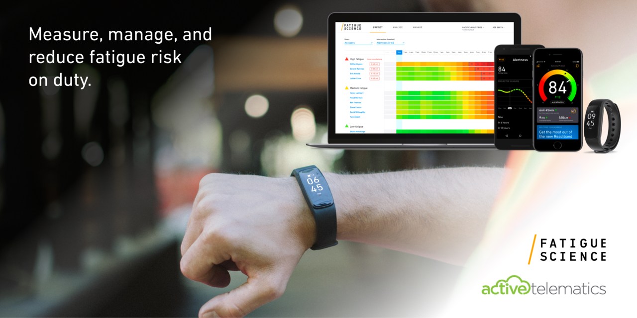 Employing a Predictive Fatigue Risk Management program in their operations, the oil & gas and transportation clients of Active Telematics are now able to utilize Fatigue Science’s Readiband Solution to measure and predict the fatigue level of workers in advance of their work shifts.